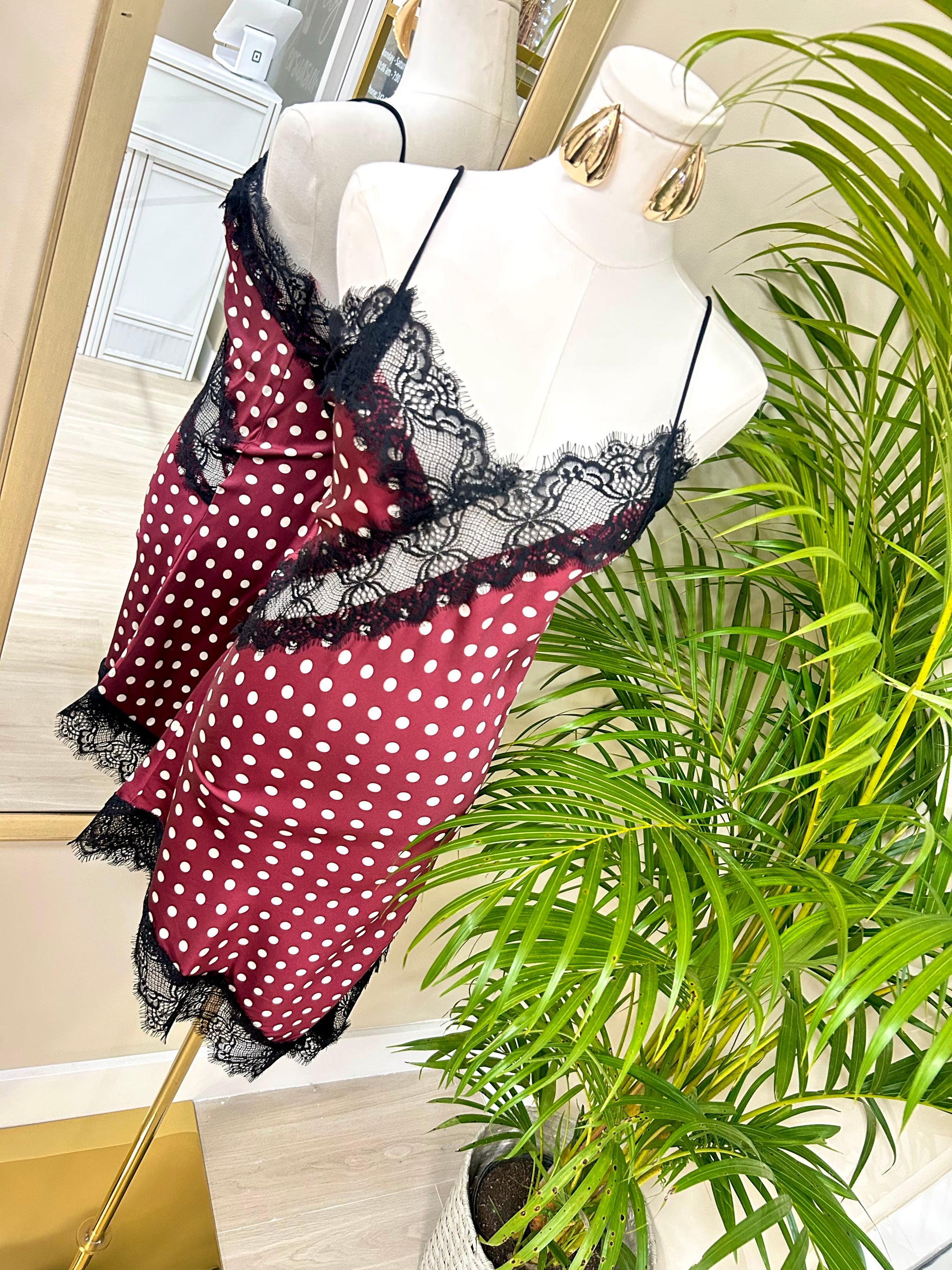 Slip into the charm of a bygone era with our Vintage Rouge Slip Dress a sultry blend of rich burgundy satin, dainty polka dots, and soft black lace that steals every glance. Designed with a flattering drape and delicate lace-trim neckline, she moves with you effortlessly, creating that perfect balance of flirt and sophistication.