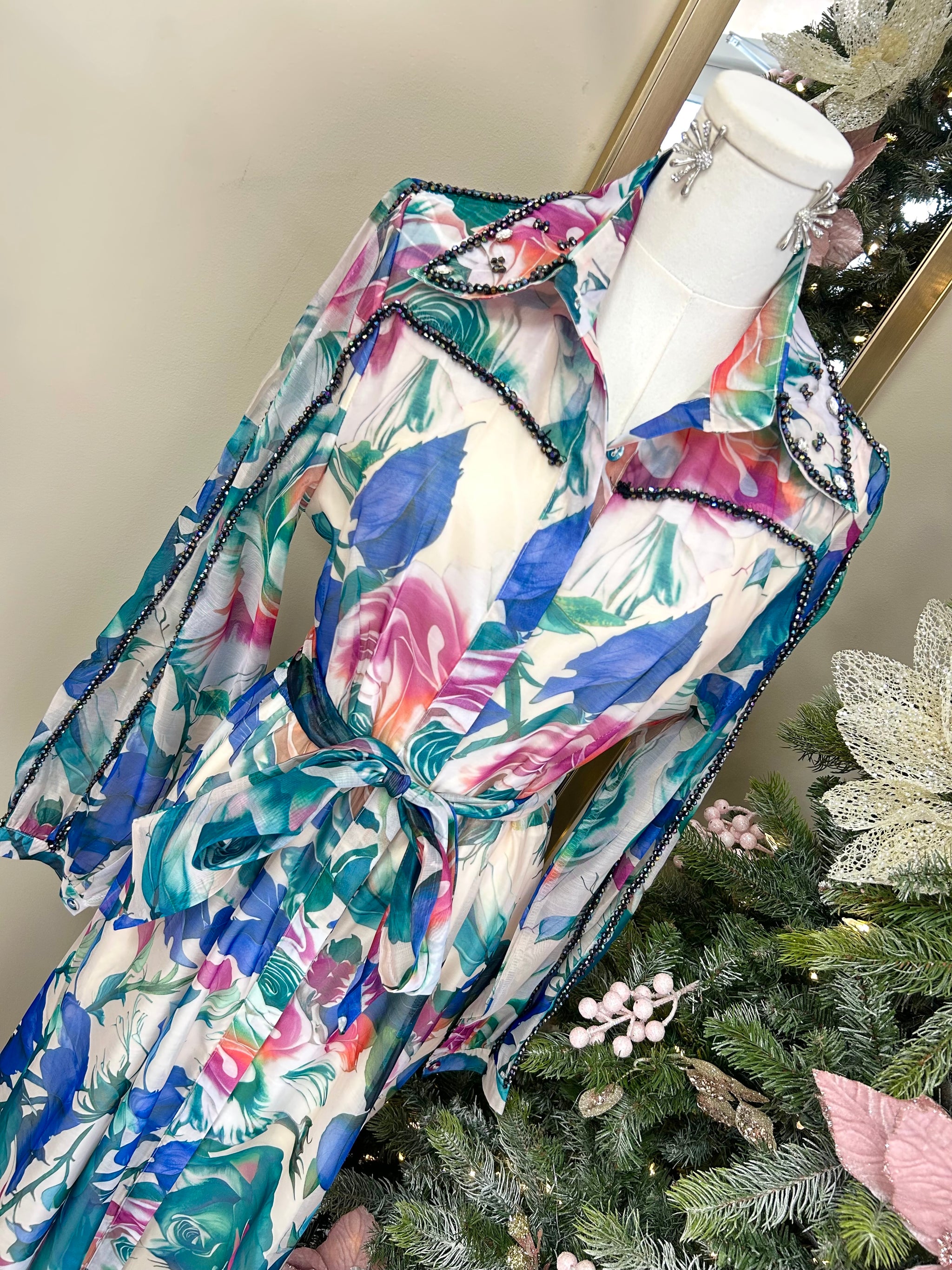 Step into a world of soft romance with the Enchanted Garden Beaded Maxi. This dreamy, sheer maxi dress features a watercolor-inspired floral print in soothing tones of teal, blush, lavender, and cream. Flowing effortlessly with every movement, it captures the magic of a painted garden brought to life.