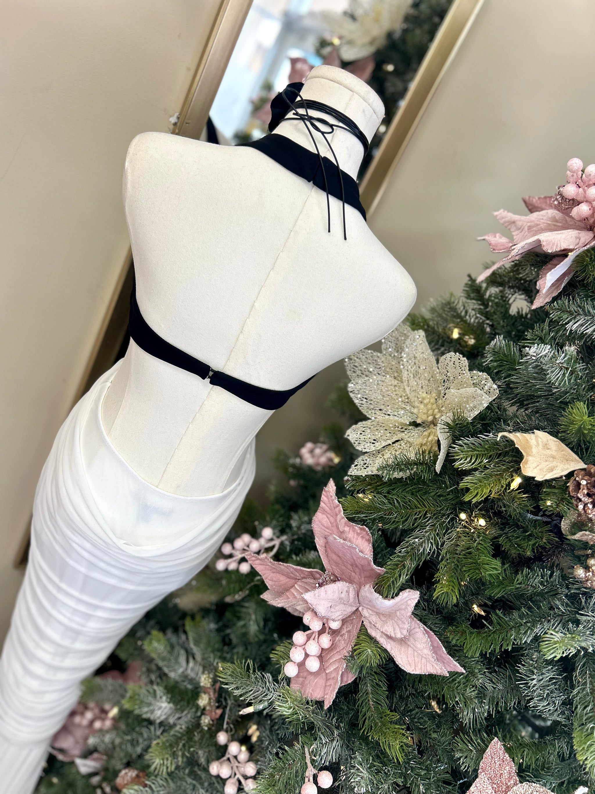 The After Twelve Two-Tone Maxi Gown is a striking study in contrast, designed for evenings that call for presence and polish. Featuring a sleek halter neckline in jet black, this gown flows into a softly structured ivory body with sculpted ruching that defines the silhouette effortlessly.