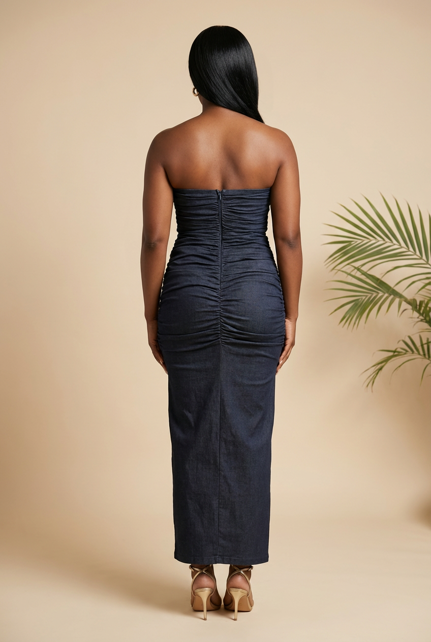 Classic denim meets modern allure in the Denim Dares Halter Maxi Dress. Designed with a sleek halter neckline and a softly structured bodice, this body-skimming silhouette hugs the figure beautifully before falling into a full-length maxi hem. Subtle ruching through the waist enhances the fit, while a side slit adds just the right touch of edge and movement.