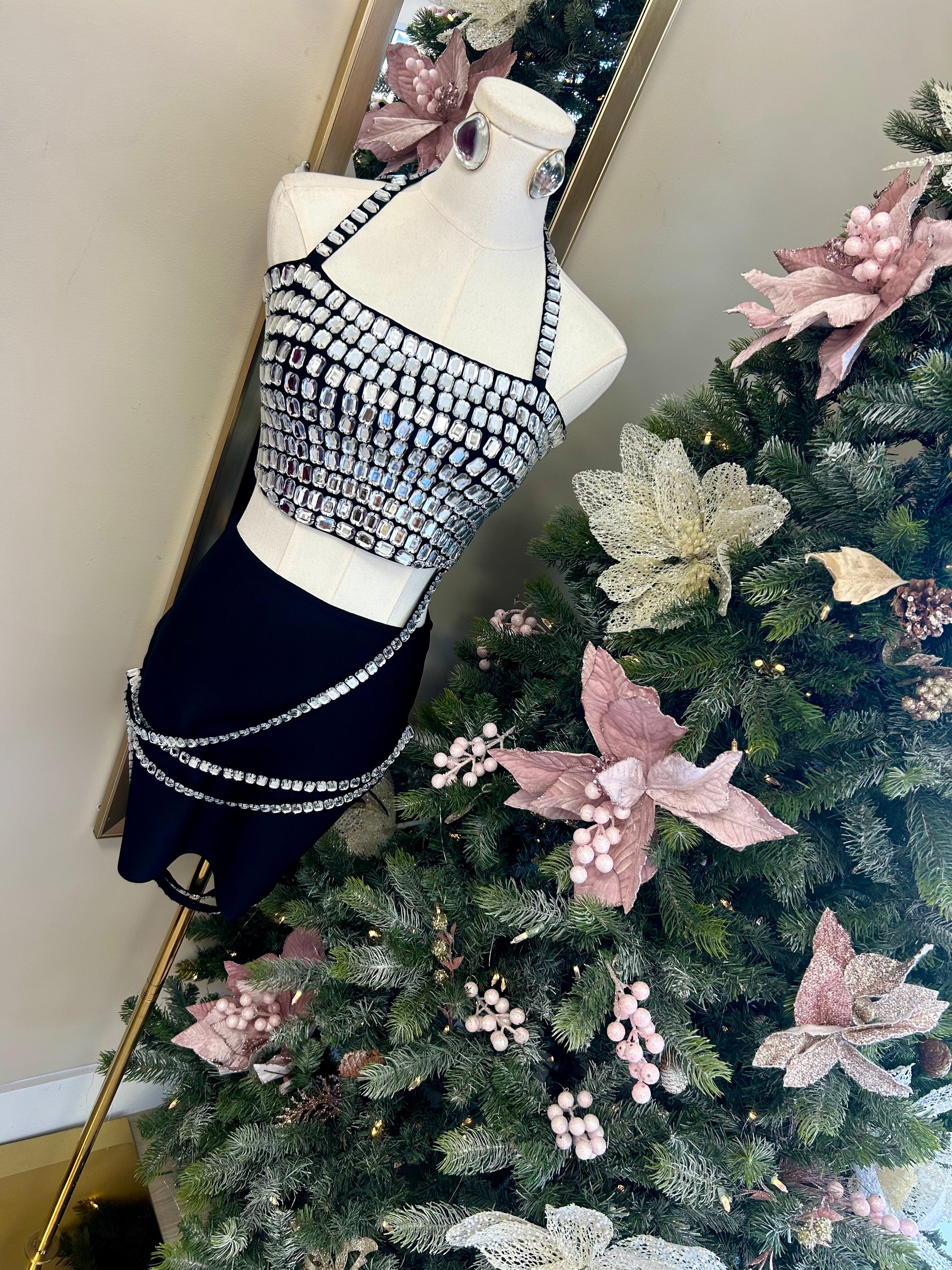 The Midnight Toast Crystal Cut-Out Mini Dress is a show-stopping New Year’s Eve moment, designed to shimmer with every step. Featuring an asymmetrical crystal-embellished bodice, strategic cut-out detail at the waist, and a sleek mini skirt finished with cascading rhinestone trim, this dress delivers bold glamour with a refined edge.