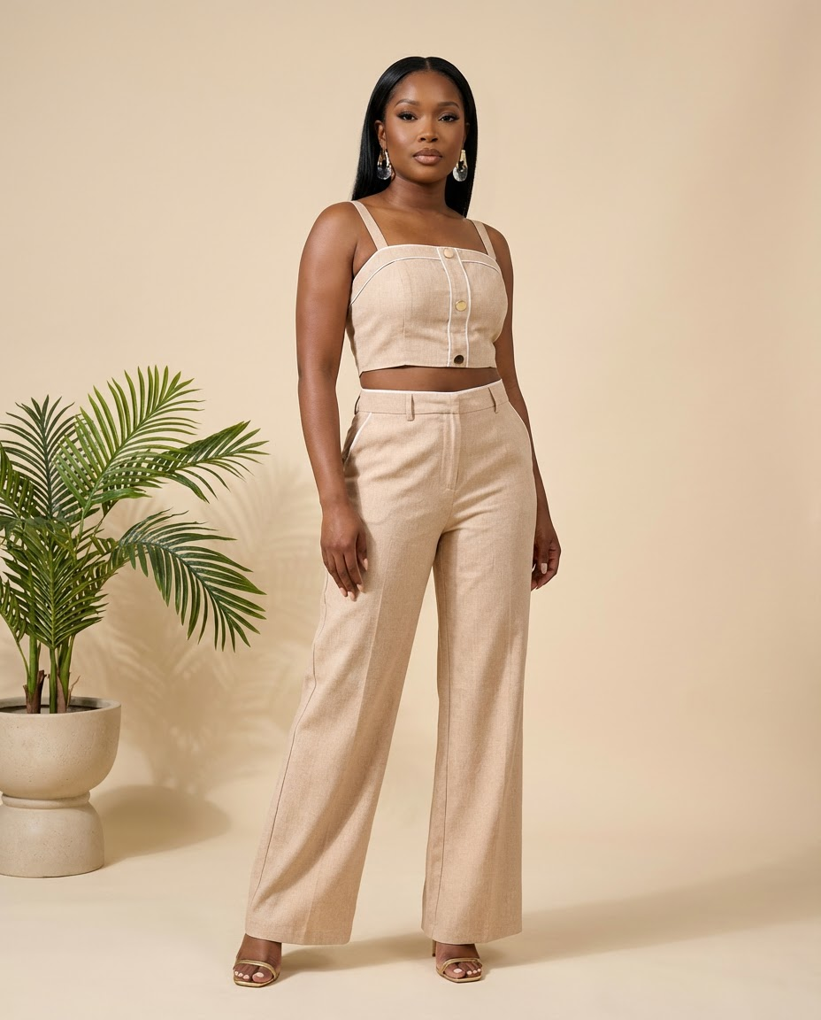 Effortlessly refined with a relaxed island feel, the Bare Luxe Linen Co-Ord is your go-to for understated elegance. Crafted in a breathable linen-blend fabric, this two-piece set features a structured cropped top with delicate button detailing paired with high-waisted, tailored wide-leg trousers that elongate the silhouette.