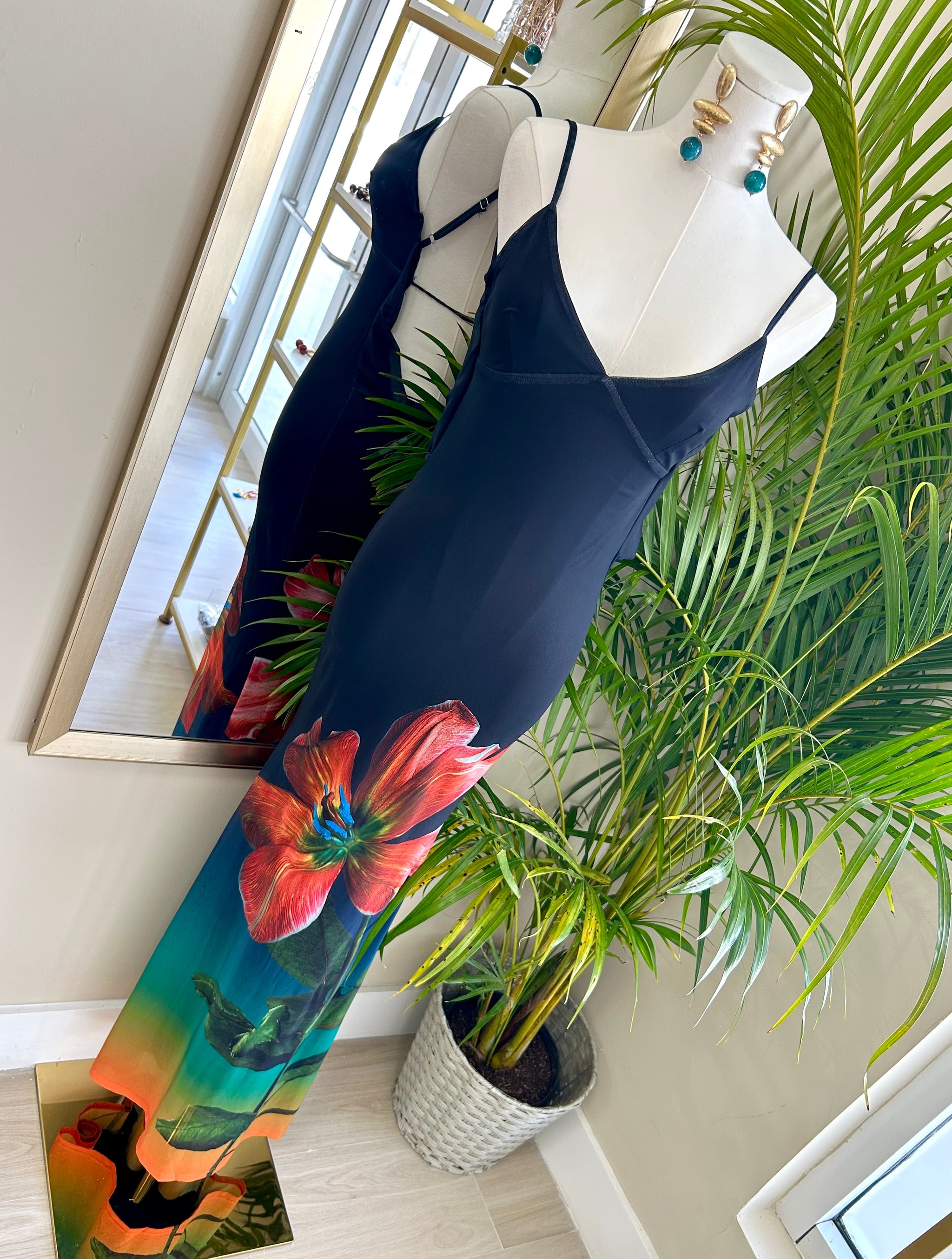 Slip into effortless island elegance with the After Dark Bloom Maxi Dress. Designed with a sleek, body skimming silhouette, this sultry slip features a low back detail and a vivid oversized floral print that blooms against a rich, twilight-toned gradient. Lightweight, stretchy, and vacation-ready, it moves with you from golden hour cocktails to candlelit dinners.. A statement piece for the woman who loves a touch of paradise after sunset.
